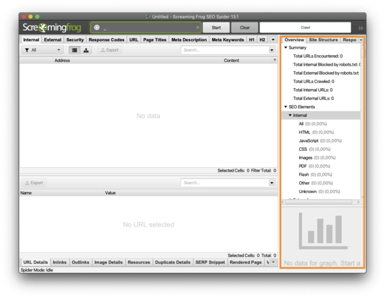 Située sur la droite de l’interface Screaming Frog, elle vous donne accès à des fonctionnalités plus détaillées sur vos URLs. La sidebar fait office de “filtre” pour choisir la vue que vous désirez. Les paramètres sont nombreux et aident à faire le choix en fonction des besoins de votre audit SEO.